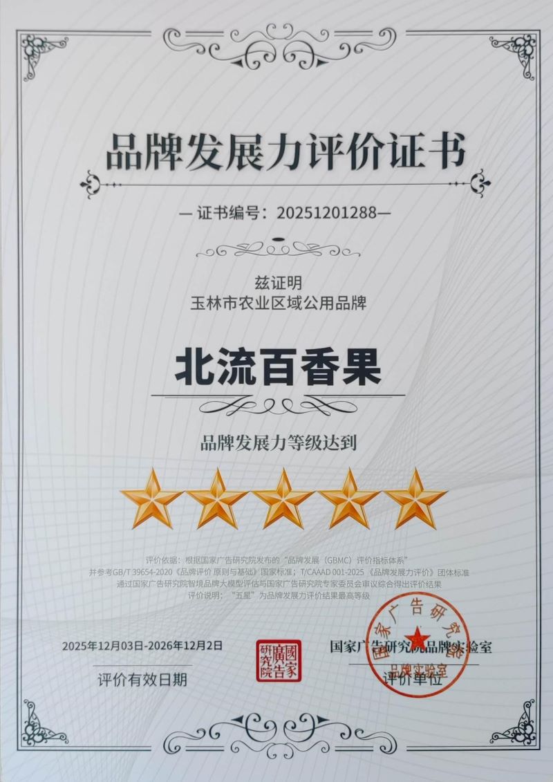 今日广西讯 日前,在海南博鳌亚洲论坛举行的2025农业品牌培育创新发展论坛上,“北流百香果”荣获国家广告研究院品牌研究中心颁发的“中国农业品牌发展力五星评价证书”,标志着其在农业品牌建设方面取得国家级权威认可。