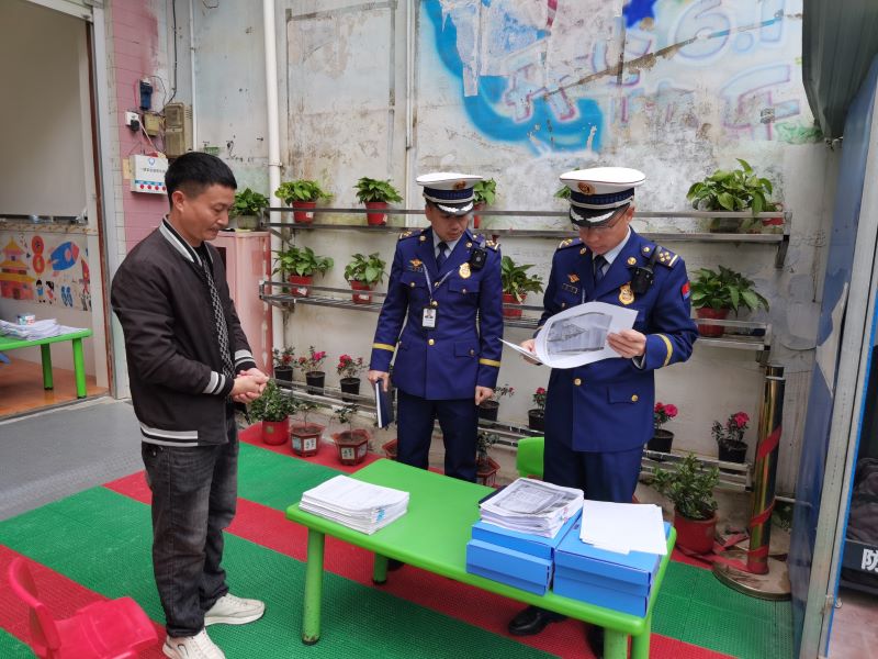 检查过程中,大队监督执法人员详细了解幼儿园消防安全管理现状,翻阅查看了幼儿园日常消防安全巡查记录、培训记录,并深入幼儿园楼道、教室、厨房及孩子们活动场所进行了实地查看,重点检查疏散指示标志、应急照明、灭火器是否配置齐全且保持完好有效;疏散通道、安全出口是否畅通;外窗是否设置了铁栅栏等影响逃生的障碍物;电气线路敷设是否符合规定;室内装修是否使用阻燃材料;厨房用火用电用气是否符合安全要求等情况进行全面细致的检查。针对检查发现的隐患问题,大队监督执法人员要求其场所责令立即整改到位。随后,向幼儿园老师讲解了用火用气用电安全知识、灭火器操作使用方法等,同时叮嘱幼儿园负责人要落实好消防安全主体责任,认真执行整改措施,确保不发生火灾事故。
