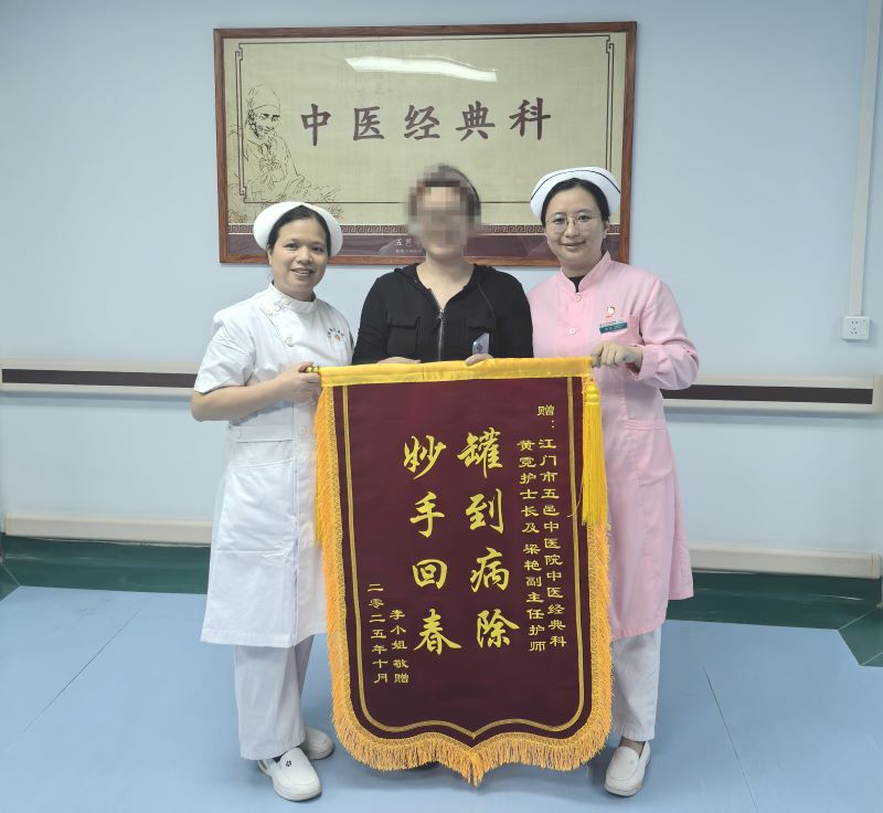 此前,李小姐长期受经络不通困扰,身体时常感到沉重不适,尝试多种调理方式效果均不明显。在接受梁艳的火龙罐调理后,症状逐渐缓解,实现了“经络尽疏,一身轻松”的治疗效果。因此,在得知梁艳即将结束进修、返回大新的消息后,为表达感谢之情,李小姐专门定制了锦旗,亲手送到梁艳手中,锦旗上的字字句句,既是对她专业技术的认可,也是对她尽职尽责态度的褒奖。