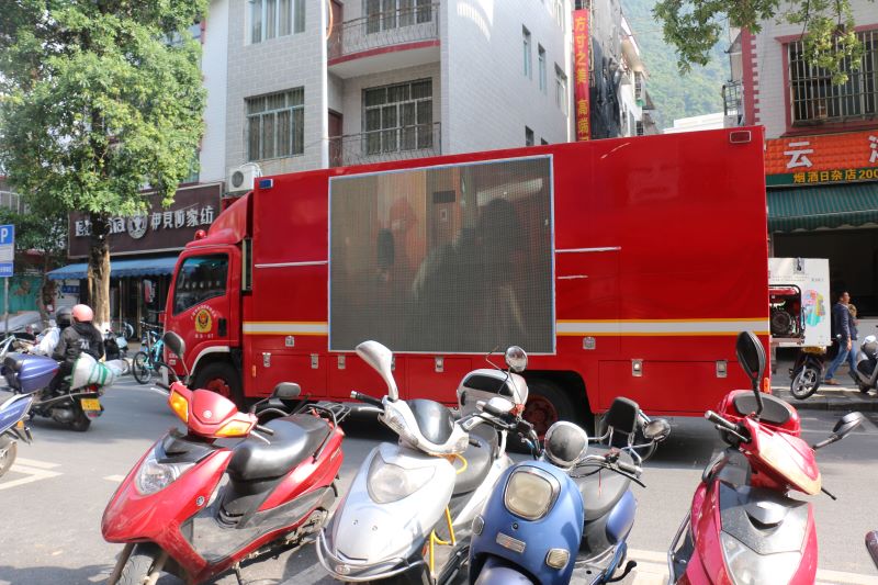 消防宣传车行驶穿梭于各个社区的大街小巷中,响亮的大喇叭配上车载LED显示屏,不间断地播放着消防安全公益广告、典型火灾案例、火场逃生教学影像、初期火灾扑救方法、消防宣传标语等内容,为群众送上生动的“流动安全宣传课”。活动中,消防宣传车不仅循环播放消防安全提示,大队宣传人员还走进社区、市场、广场等人流密集场所,发放宣传手册,结合辖区实际情况和季节特点,针对群众消防意识较为淡薄的客观形势,开展了面对面的宣传讲解,详细讲述了消防安全的重要性和必要性,向群众讲解春季火灾特点,“小火亡人”防范措施、如何正确拨打119火警电话、家庭防火用电、初期火灾扑救的方法等知识,重点提示了炉灶烧火做饭不离人、使用电褥子要切忌温度过高、电暖气要注意避开易燃品、严禁卧床吸烟等注意事项。