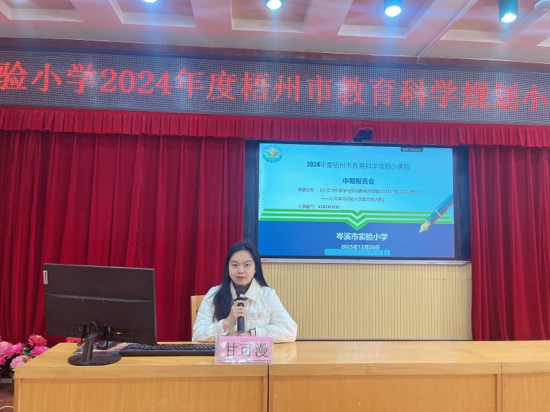 汇报环节,各课题主持人依次登台,全面呈现研究进展与阶段性成果:岑佩恩副主任主持的2024年度梧州市教育科学规划小课题《小学习作教学与劳动教育深度融合“353”模式的实践探究——以岑溪市实验小学高年级为例》,构建了“三方联动、五大途径、三力提升”的融合教学模式,以学校、家庭、社会协同育人为支撑,通过“看、做、说、思、写”五大途径,着力提升学生实践、写作与创新能力。课题组创新打造“过程性+表现性+发展性”三维动态评价体系,已开发多个优质课例,学生习作素材更鲜活,劳动观念显著转变,相关课例已斩获区、市、县多级奖项。