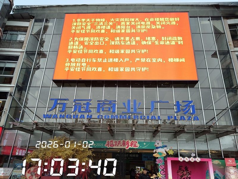 同时,大队发动辖区商场超市、医院学校、沿街商铺等单位,利用户内外LED显示屏全天候滚动播放消防宣传标语和科普短视频。“电动自行车不进楼,平安家园共守护”等醒目标语,配合家庭防火“三清三关”实操演示视频,在人员密集场所形成强烈视觉冲击,让群众在潜移默化中学习消防知识。针对夜间火灾风险,大队还协调商圈、社区LED屏延长播放时间,扩大宣传覆盖面。