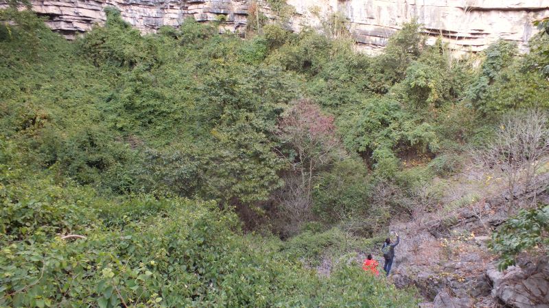 天坑坑口呈椭圆形,宽处约150米,窄处约100米,深度估摸约60多米,站在坑口岩石上俯视,不由得让人有些头晕目眩。