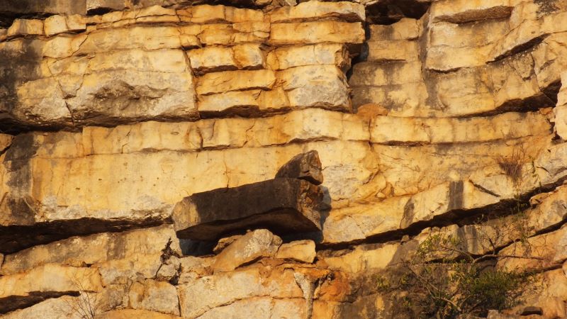 天坑底部层状石头上镶嵌着一些贝壳等古生物化石,见证着这片区域远古时代曾为海洋的历史。