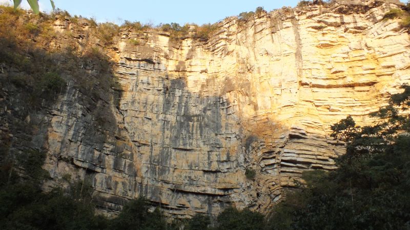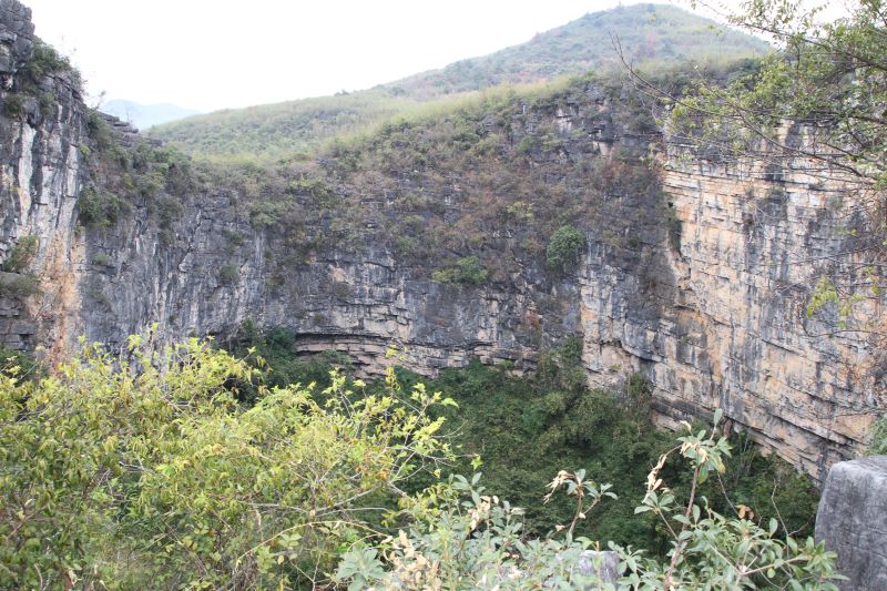 陡峭的岩壁一层层垒叠,宛如人工修砌的城墙,这个直径约一两百米的大型天然漏斗,静静躺卧在恭城下莫村东侧山腰已千万年。