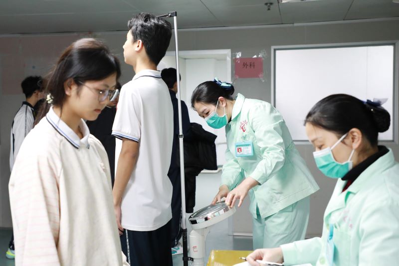 体检现场秩序井然。考生们在医护人员与学校老师的共同引导下,有序完成内科、外科、眼科、耳鼻喉科等项目检查。面对部分考生的紧张情绪,医护人员主动关心、耐心安抚,并仔细讲解检查注意事项,帮助同学们放松心情、配合检查。