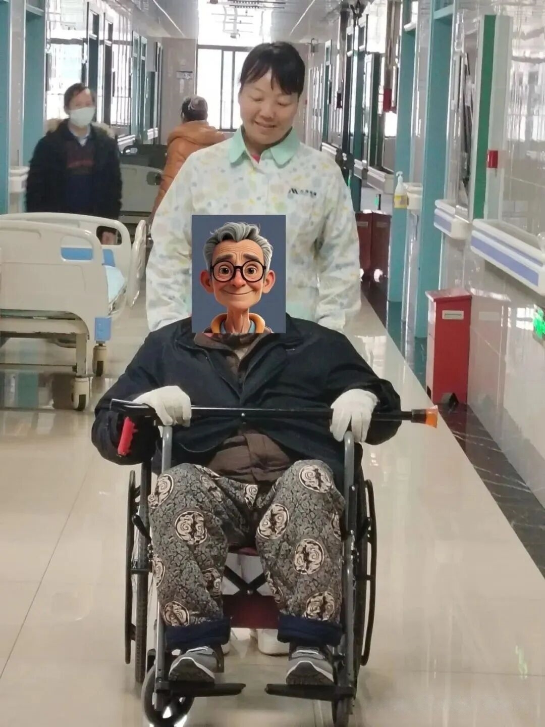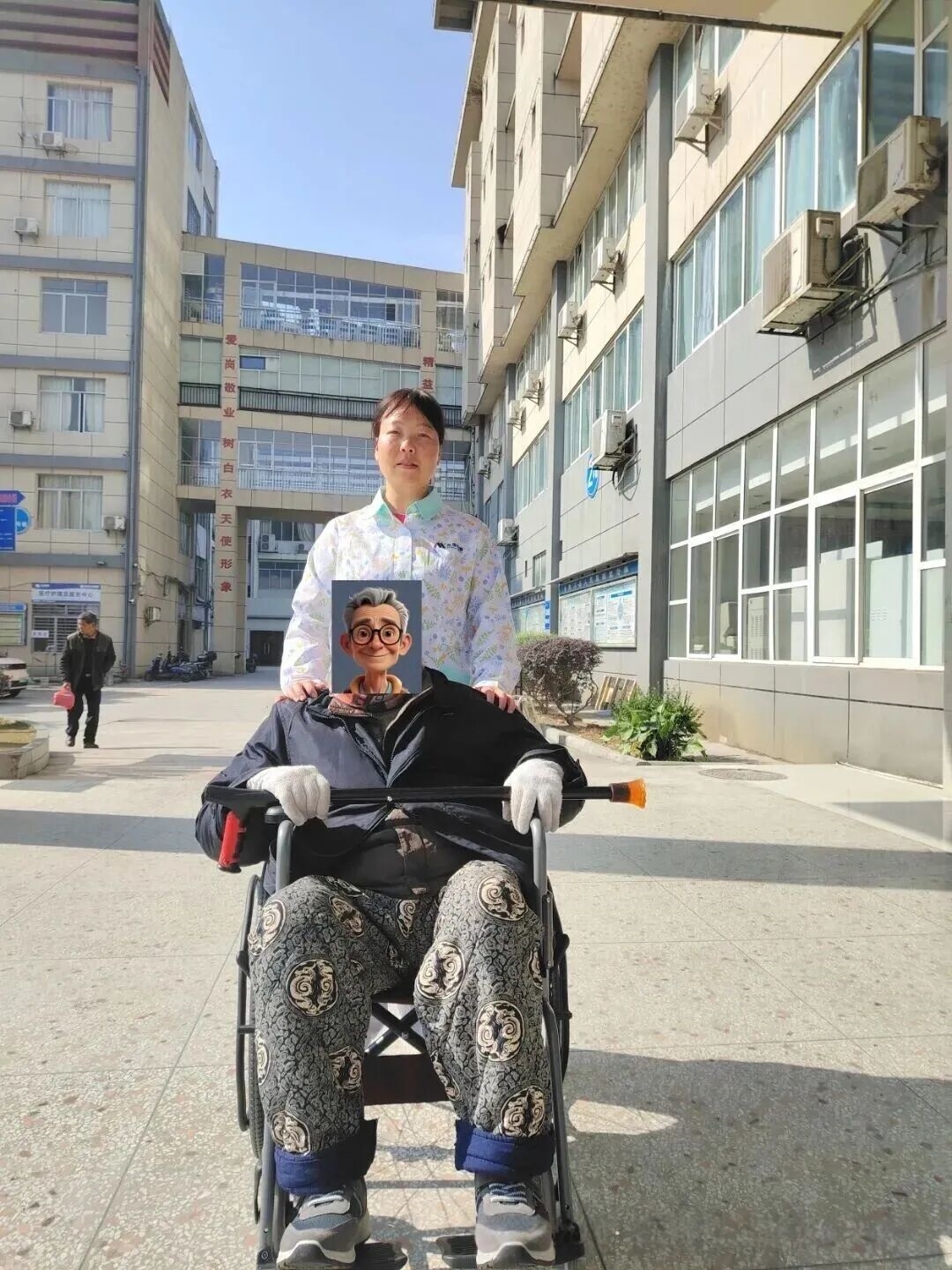 护理员陪秦大爷做康复锻炼 护理员陪秦大爷到户外晒太阳