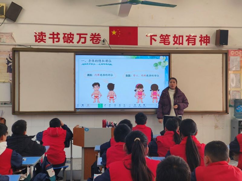 班会课上,班主任们结合小学生认知特点,通过PPT课件、动画短片、情景模拟等多元形式展开教学。低年级课堂以“身体的小秘密”互动游戏破冰,老师用通俗语言讲解“背心、裤衩覆盖的部位是隐私部位”,通过“你说我指”小游戏帮助学生准确识别隐私区域,树立“我的身体我做主”的自我保护意识。中高年级则聚焦危险识别与应对技巧,通过“陌生人搭讪”“熟人过度接触”等情景模拟,引导学生分辨言语、触碰、独处等危险信号,掌握“勇敢说不—迅速逃离—及时求助”的安全三步法。