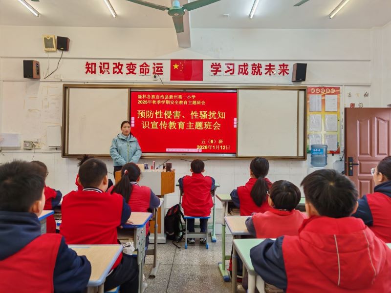 今日广西百色讯 2026年1月12日, 为筑牢未成年人健康成长安全防线,提升学生自我保护意识与应急处置能力,新州第一小学组织全校各班级开展“预防性侵害性骚扰安全知识宣传”主题班会,以生动易懂的教育形式为孩子们送上“安全防护指南”。