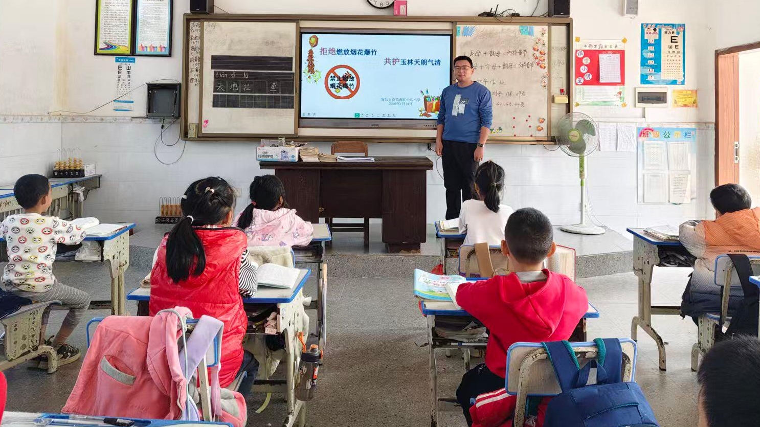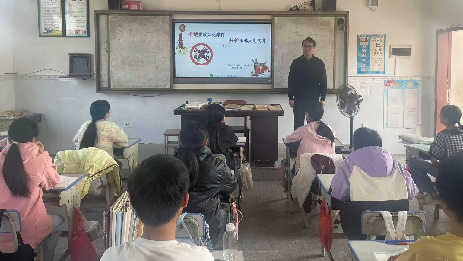今日广西玉林讯 为切实强化学生环保与安全意识,1月14日,容县自良镇两江中心小学组织各班级集中开展“拒绝燃放烟花爆竹 共护玉林天朗气清”主题班会活动。