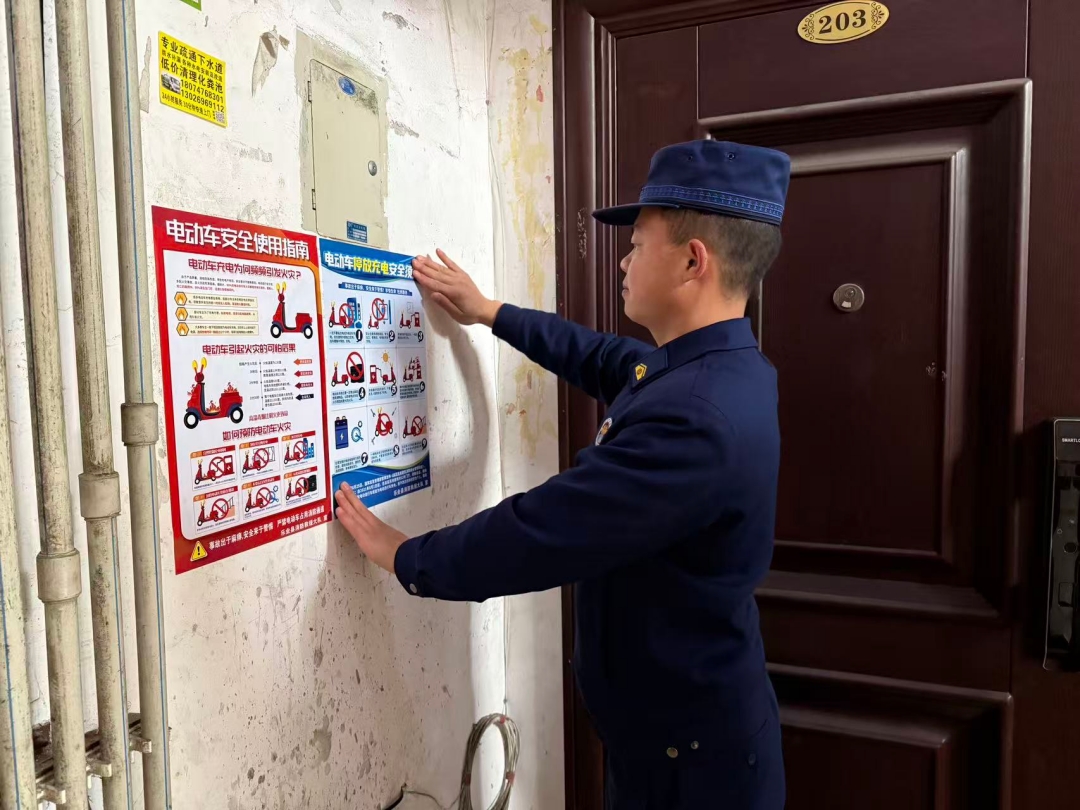 在张贴过程中,宣传人员针对高层建筑火灾特点及电动车火灾高发的安全隐患,在小区出入口、楼道墙面等醒目位置进行张贴。宣传人员对物业管理人员、过往居民开展面对面的消防安全宣讲,结合海报内容,耐心讲解高层建筑火灾的危险性、日常防火注意事项以及初起火灾的处置方法,提醒居民务必保持疏散通道畅通,不在楼道内堆放杂物,规范停放电动自行车,定期检查家中电器线路,养成良好的消防安全习惯。同时,积极指导物业管理单位落实消防安全主体责任,加强日常巡查检查,确保消防设施完好有效,共同维护高层建筑的消防安全环境。
