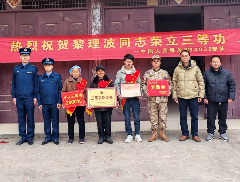 今日广西崇左讯 2026年1月22日,广西宁明县寨安乡浦邱村即将退役军人黎理波家中,锣鼓喧天,爆竹声声,热闹非凡。由宁明县寨安乡武装部、宁明县退役军人事务局、中国人民解放军94038部队以及浦邱村“两委”干部代表组成的慰问组,为黎理波父母、弟弟等亲属送上三等功喜报、立功牌匾和慰问金,一起共享这一荣耀时刻。