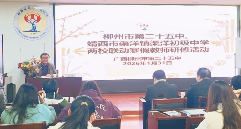 为认真学习贯彻党的二十届四中全会精神,精准对接学校教育教学需求,弘扬爱国主义精神、教育家精神,1月31日下午,柳州市老科协组织教育、科普领域专家团队走进学校,参加柳州市第二十五中学、靖西市渠洋镇渠洋初级中学两校联动寒假教师研修活动。广西第三批科学家精神宣讲团成员、柳州市老科协副会长、广西科普演讲团柳州分团团长、市教育局原党委书记殷茁雄带领市老科协教育专家团队成员姜锦红、艾秀清、科普演讲分团讲师唐恢天,二十五中党总支书记黄振霜、校长张廷军、德育副校长覃柳华、教学副校长梁逸绯、小学执行校长刘婷婷、副校长潘晶等参加了此次活动,殷书记一行为全校100多名教师带来弘扬教育家精神系列宣讲及学校如何开展青少年科技教育活动的建议等。渠洋中学老师通过现场网络传输收看了宣讲报告会实况。
