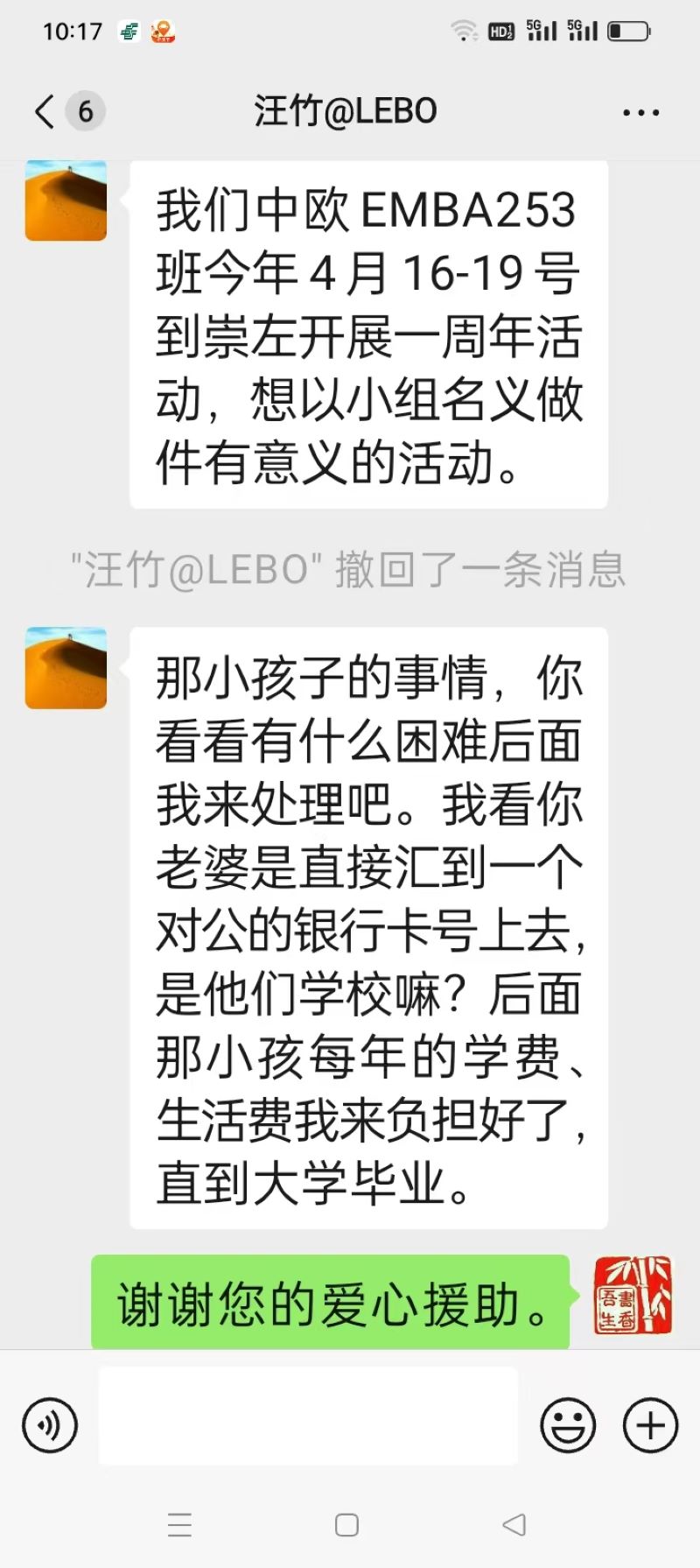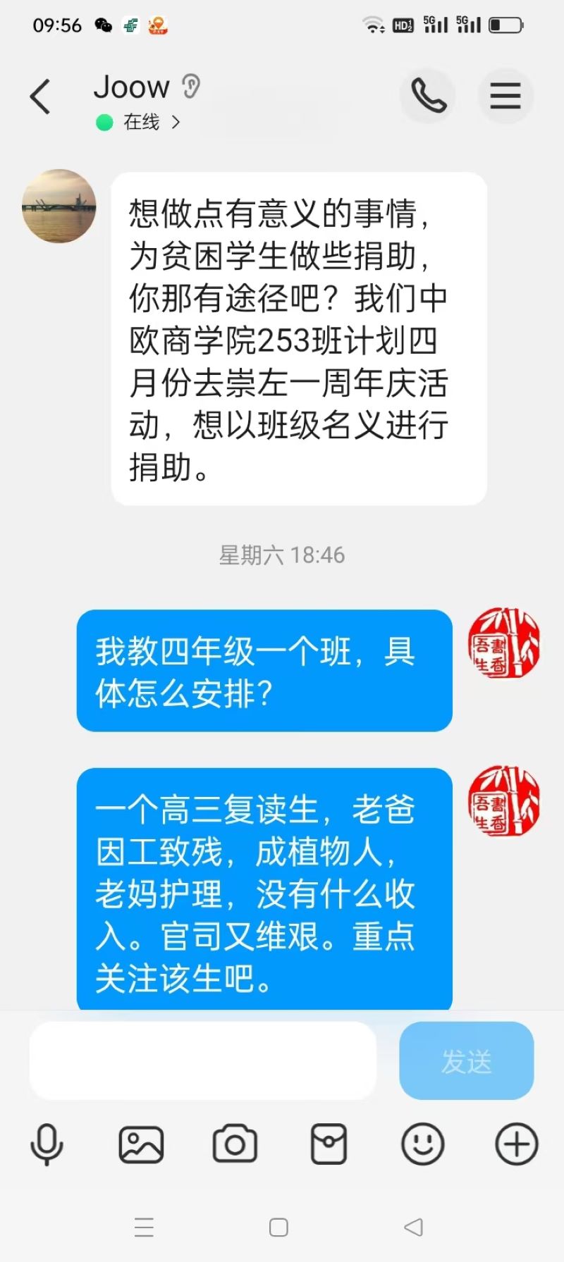 网名“Joow”远在江苏,网名“书香吾生”为广西崇左市大新县人。两人于十几年前因互相崇拜对方文学底蕴而结交为QQ好友。经过近二十年的奋斗,前者已由之前的造船厂技术员蜕变为功成名就的企业家,目前经营一家电子设备公司。其在读的中欧商学院EMBA2025SH3班(工商管理硕士2025届上海3班)拟在今年4月到崇左以班级名义开展一场总价值为10万元人民币的捐资助学活动。请求崇左好友寻找捐助途径。目前,两者正在积极推进该捐助方案。争取爱心款项惠及边境学校学子。