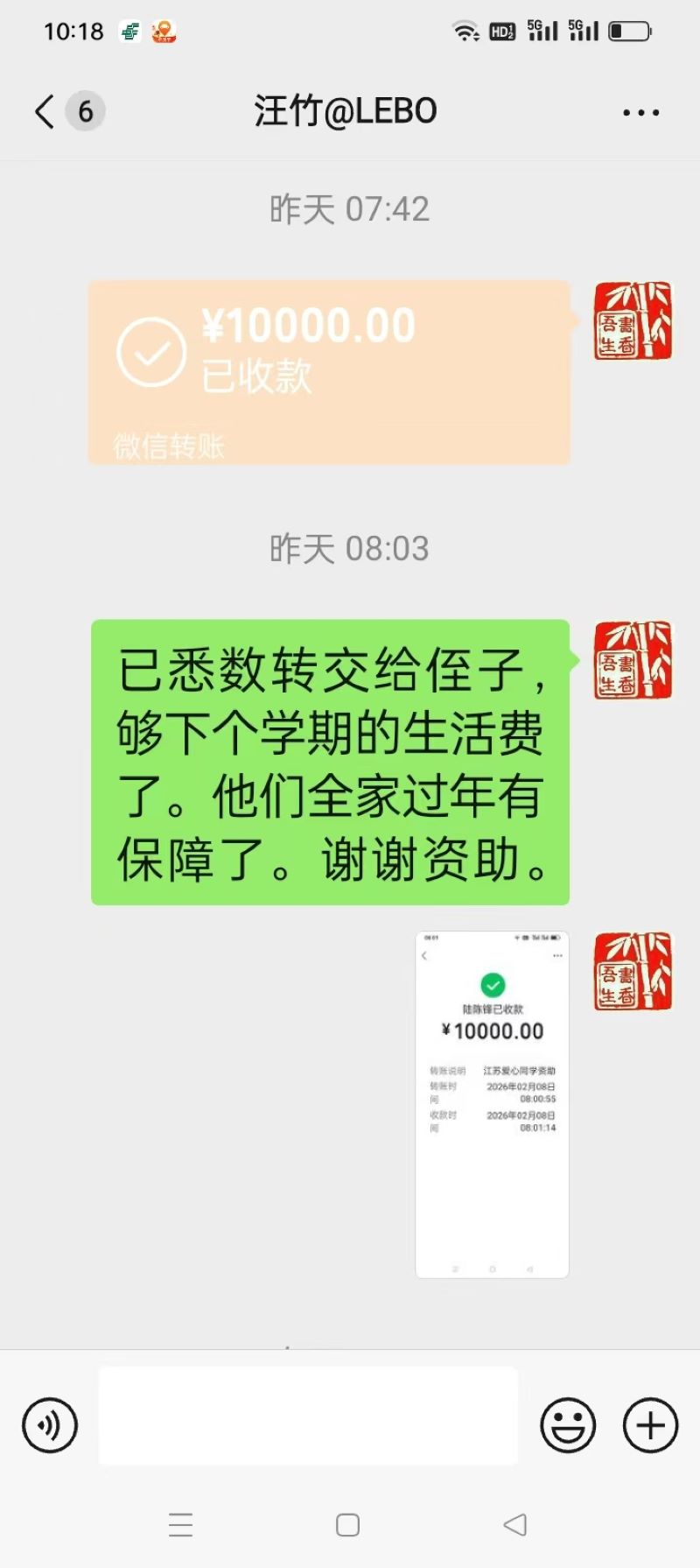 交流中,“书香吾生”向“Joow”透露身边的一个贫困家庭,父亲因工致残,完全丧失生活自理能力,母亲全天候护理,无经济收入支撑家庭开支。还有一个高三复读生,全靠其他亲人供读,家庭生活极其贫困。得知情况后,“Joow”立即以个人名义,通过好友微信,慷慨资助1万元,用于基本生活开支和过年生活保障。当日,受助学子立即乘坐高铁,奔赴四川与家人团聚。“Joow”还表态,今后其个人还持续关注该贫困学子,承担大学期间的费用。用企业家的大爱行动温暖边境贫困家庭,鼓励贫困学子奋发图强。