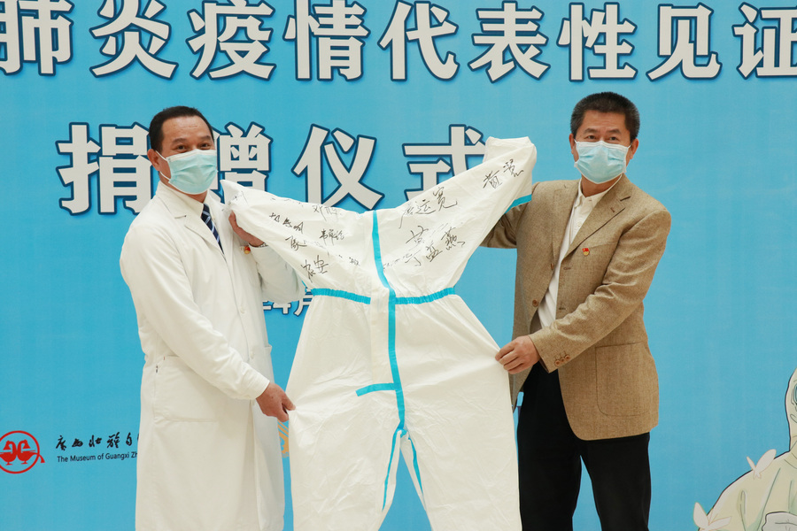 当天还举行了“抗击新冠肺炎疫情代表性见证物捐赠仪式”,广西国际壮医医院向广西壮族自治区博物馆捐赠了一批抗疫见证物。这批抗疫见证物见证了广西国际壮医医院的勇士们在湖北的点点滴滴,同时也是中医、壮瑶医药有效参与新冠肺炎防治的“无声证人”。吴伟峰说:收集、保存和展示这些承载中华民族精神与时代记忆的见证物,正是博物馆的重要职责和使命所在。广西壮族自治区博物馆将对这批抗疫见证物妥善保管、展示,让更多的人看到和记住我们伟大的抗疫岁月。